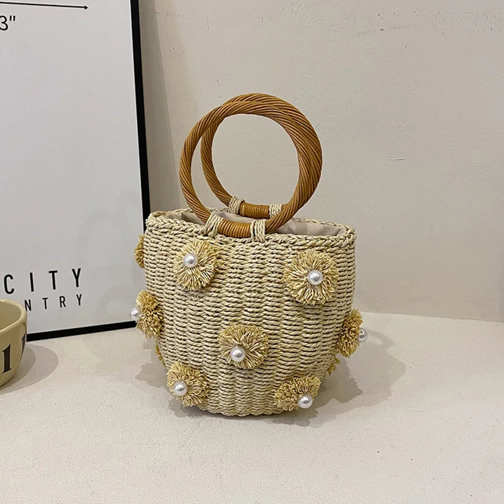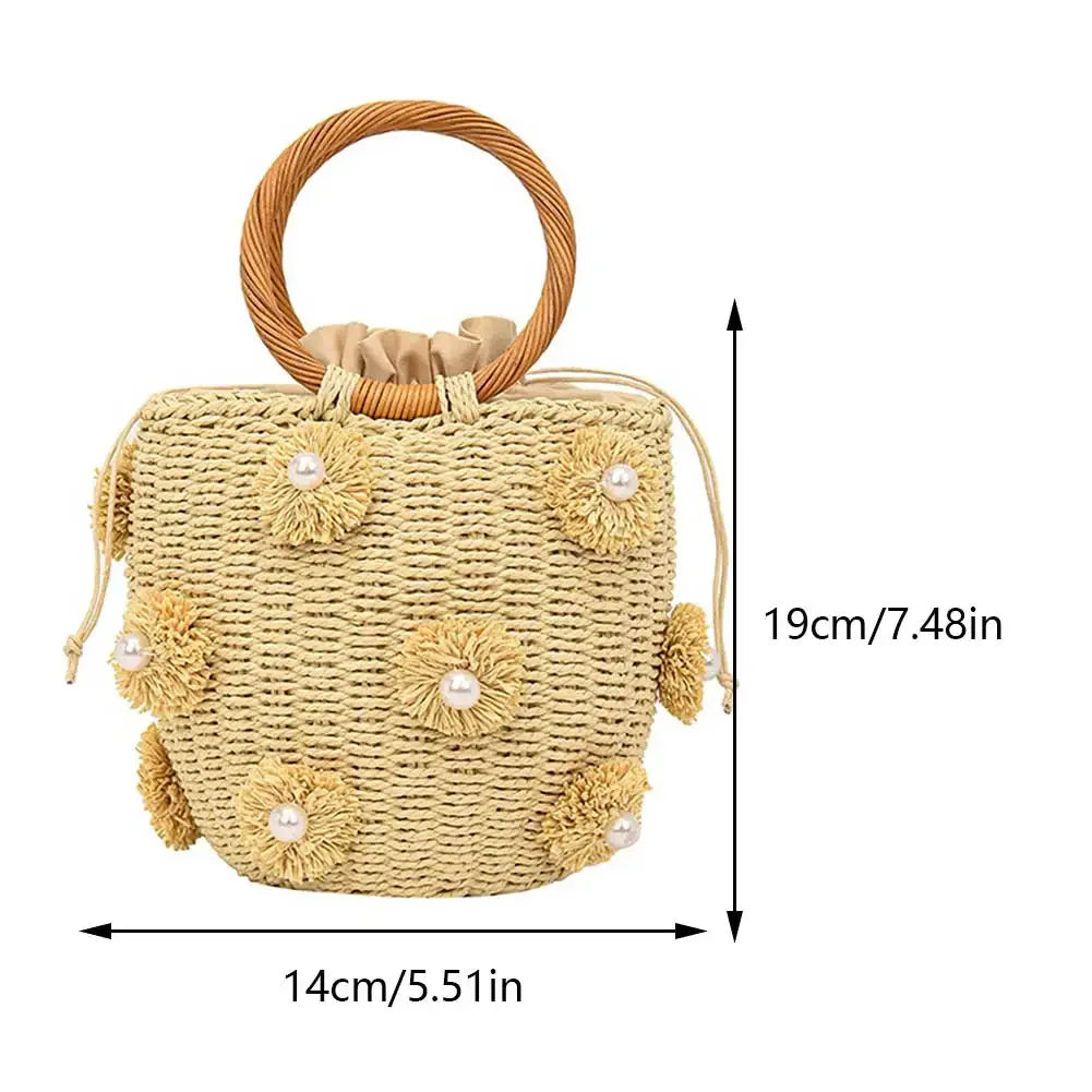 Women Drawstring Wrist Purse with Pearls Bohemia Bucket Handbag Hand-Woven Straw Bag Summer Holiday Beach Bag Specification: Origin: Mainland China Shape: Bucket Main Material: Straw Lining Material: Nylon Product Size: 190.00*140.00*120.00mm/7.48*5.51*4.72inch, Handheld 110mm/4.29in Place Of Origin: SHAN DONG Province