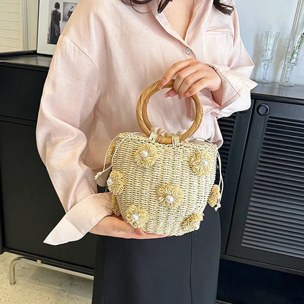 Drawstring Straw Bucket Bag Women New 2024 Fashion Rattan Crochet Tote Handbag Purses Wrist Woven Straw Bag for Summer Beach Bag